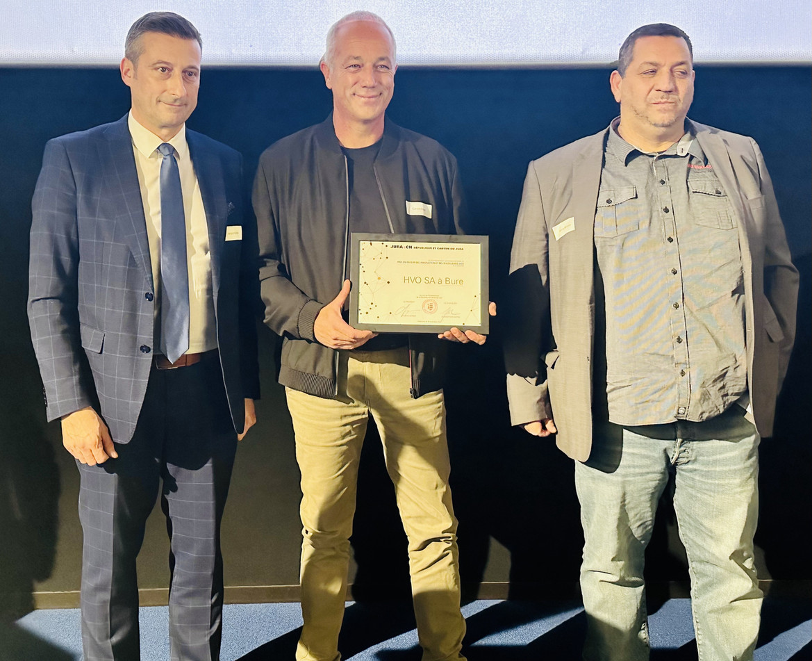 Le Président du Gouvernement Jacques Gerber a remis le Prix à Messieurs Claude Etique et Samuel Moussa, fondateurs de HVO SA, lors du traditionnel «RDV ÉCO» organisé par la Promotion économique cantonale qui s’est déroulée le 16 novembre à Cinémont.