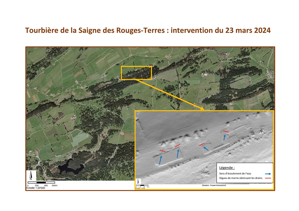 La tourbière de la Saigne des Rouges-Terres a fait l’objet jusqu’au milieu du siècle dernier d’une exploitation de sa tourbe. Cette utilisation a morcelé la tourbière et porté une forte atteinte à sa biodiversité. Faute de bois de chauffage, la tourbe était débitée en briquettes et utilisée comme combustible pour chauffer les foyers. Ainsi, des fosses d’extraction ont été creusées. Afin de pouvoir travailler «au sec», des drains y ont été aménagés, entraînant l’eau, le plus souvent, en direction de dolines naturellement présentes autour de la tourbière. Ce sont précisément ces exutoires périphériques qu’il s’agit aujourd’hui d’obstruer avec de la marne argileuse afin de remettre le terrain en eau.