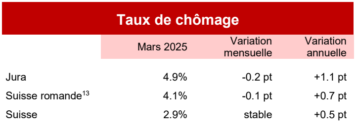 Le taux de chômage se situe à 5.5% dans le district de Delémont, 5.1% dans celui de Porrentruy et 2.8% dans celui des Franches-Montagnes.