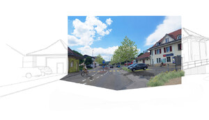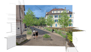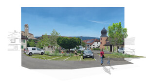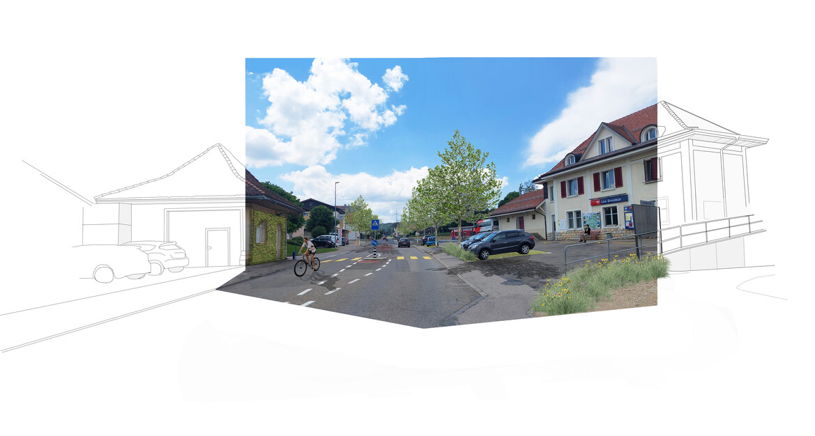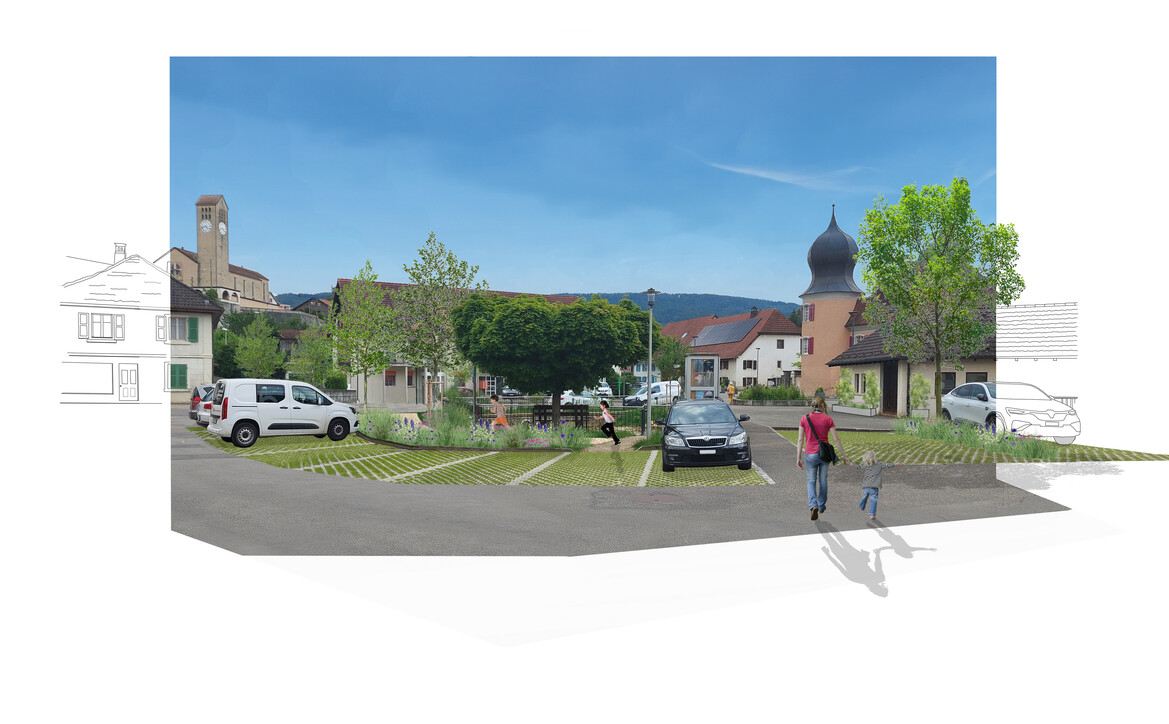 Trois sites représentatifs ont été sélectionnés dans chaque district du territoire jurassien afin d’illustrer les possibilités d’aménagement au sein des communes. Ces sites servent d’exemples pour démontrer un potentiel d’amélioration allant dans le sens de la lutte contre le phénomène d’îlots de chaleur. Les images datent de mai 2024 et peuvent ne plus correspondre à la situation actuelle alors que les projections fictives ont été conçues au cours de l’été 2024 et sont purement hypothétiques.