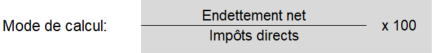 Définition: le quotient d'endettement net indique la part des revenus fiscaux (impôts directs des personnes physiques et des personnes morales) ainsi que des prestations de la péréquation financière qui seraient nécessaires pour amortir la dette nette. Une valeur négative atteste de l'existence d'une fortune nette.