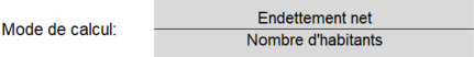 Définition: l'endettement net en francs par habitant mesure l'importance de la dette et doit être apprécié en même temps que la capacité financière de la commune (quotité d'autofinancement). Une valeur négative reflète l'existence d'une fortune nette par habitant.