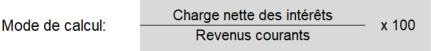 Définition: la quotité de la charge des intérêts nets indique la part de revenus qui est absorbée par les intérêts nets. Plus elle est élevée et plus l'endettement est important. A l'inverse, moins elle est élevée et plus grande est la marge de manœuvre financière de la collectivité. Une quotité de la charge des intérêts négative signifie que les revenus du patrimoine sont supérieurs au montant des intérêts de la dette. Cet indicateur reflète donc la situation financière de la commune.