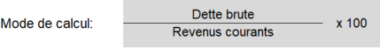 Définition: la dette brute par rapport aux revenus permet d'évaluer la situation d'endettement, et en particulier de déterminer si l'endettement est proportionné compte tenu des revenus obtenus. Cet indicateur renseigne sur le pourcentage des revenus qui est nécessaire au remboursement de la dette brute en une seule fois.