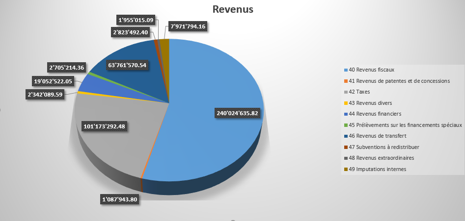 Les revenus s'élèvent à 4,83 millions de francs (4,47 millions en 2022). Les revenus financiers, constitués principalement des revenus des biens-fonds, des bâtiments et des immeubles, totalisent 2 millions de francs, comme en 2022. Les taxes perçues, dont celles liées aux revenus des ventes, s'élèvent à 1,4 million de francs (1,3 million en 2022).