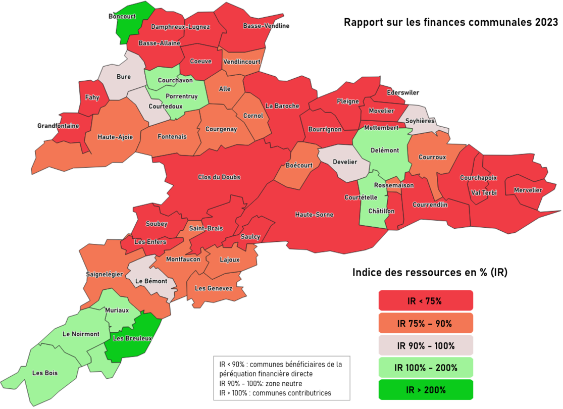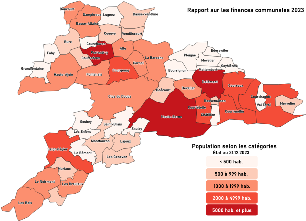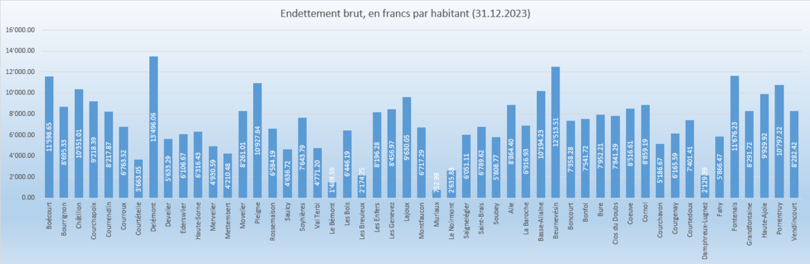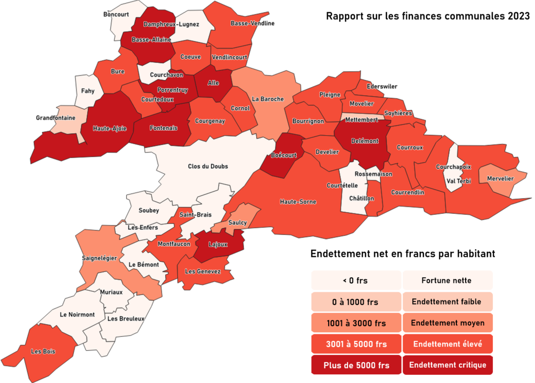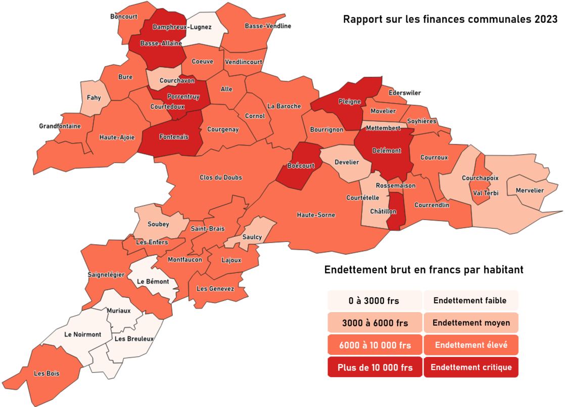 L’endettement net en francs par habitant de l’ensemble des communes jurassiennes s’élève à 4'013.56 francs (4'053.23 francs en 2022; 3'877.40 en 2021). Il est considéré comme élevé.