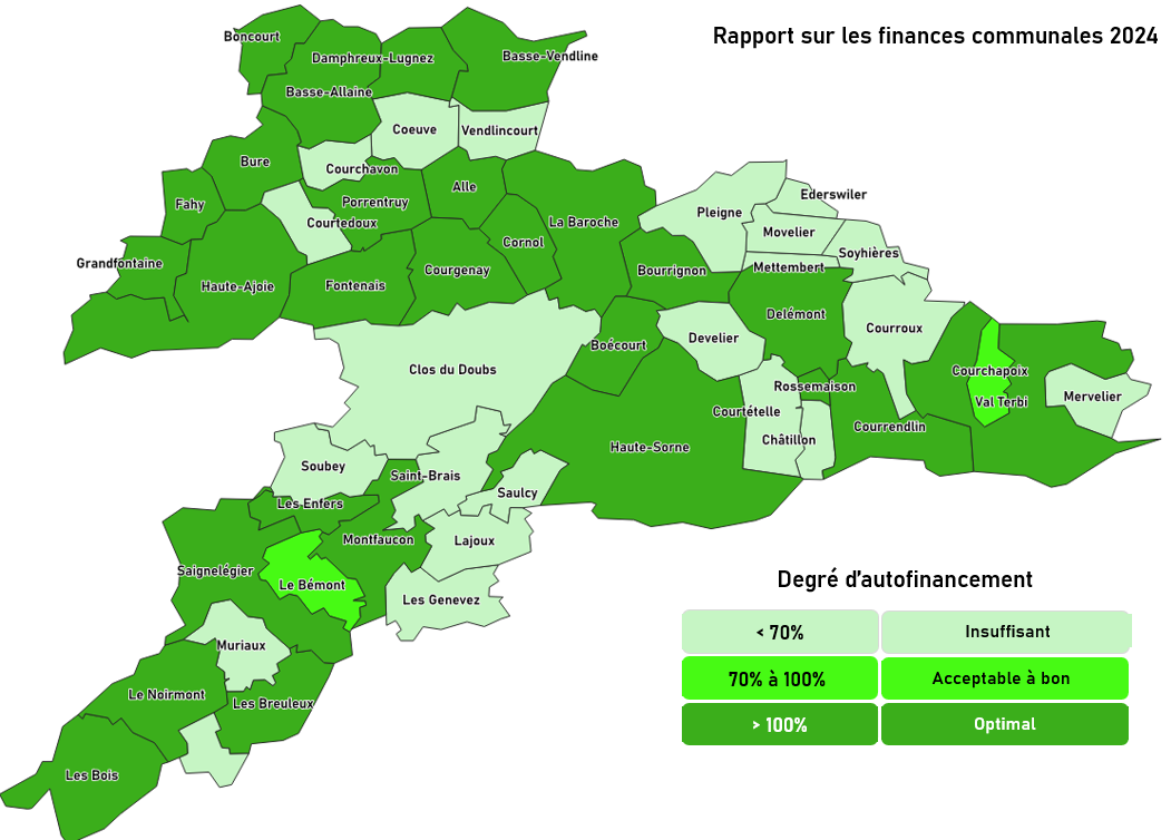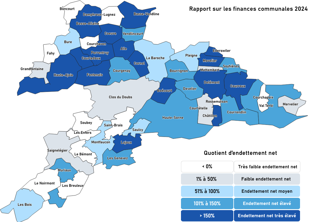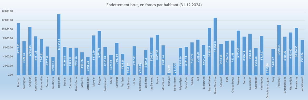L’endettement net en francs par habitant de l’ensemble des communes jurassiennes s’élève à 3'644.59 francs en 2024 (4'013.56 en 2023; 4'053.23 en 2022; 3'877.40 en 2021). Il est considéré comme élevé.
