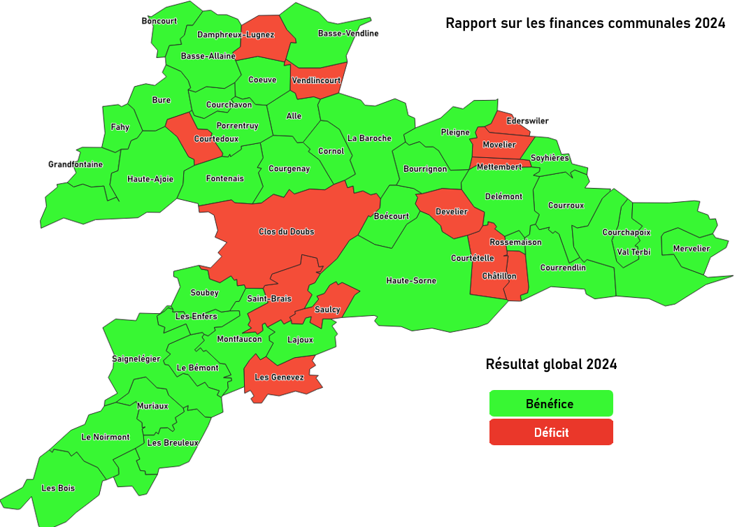 L’exercice 2024 des communes jurassiennes présente un résultat global considéré comme réjouissant, avec un bénéfice consolidé de 17,5 millions de francs, en augmentation de plus de 10 millions de francs par rapport à l'exercice 2023 (7,3 millions de francs). Ce résultat s'explique notamment par une hausse conséquente des contributions fiscales, une augmentation des taxes et un certain nombre de réévaluations d'immeubles du patrimoine financier.