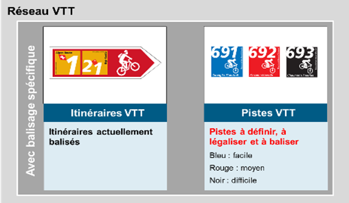 - Les pistes VTT. Le réseau des pistes VTT en développement compte une soixantaine de tracés techniques.