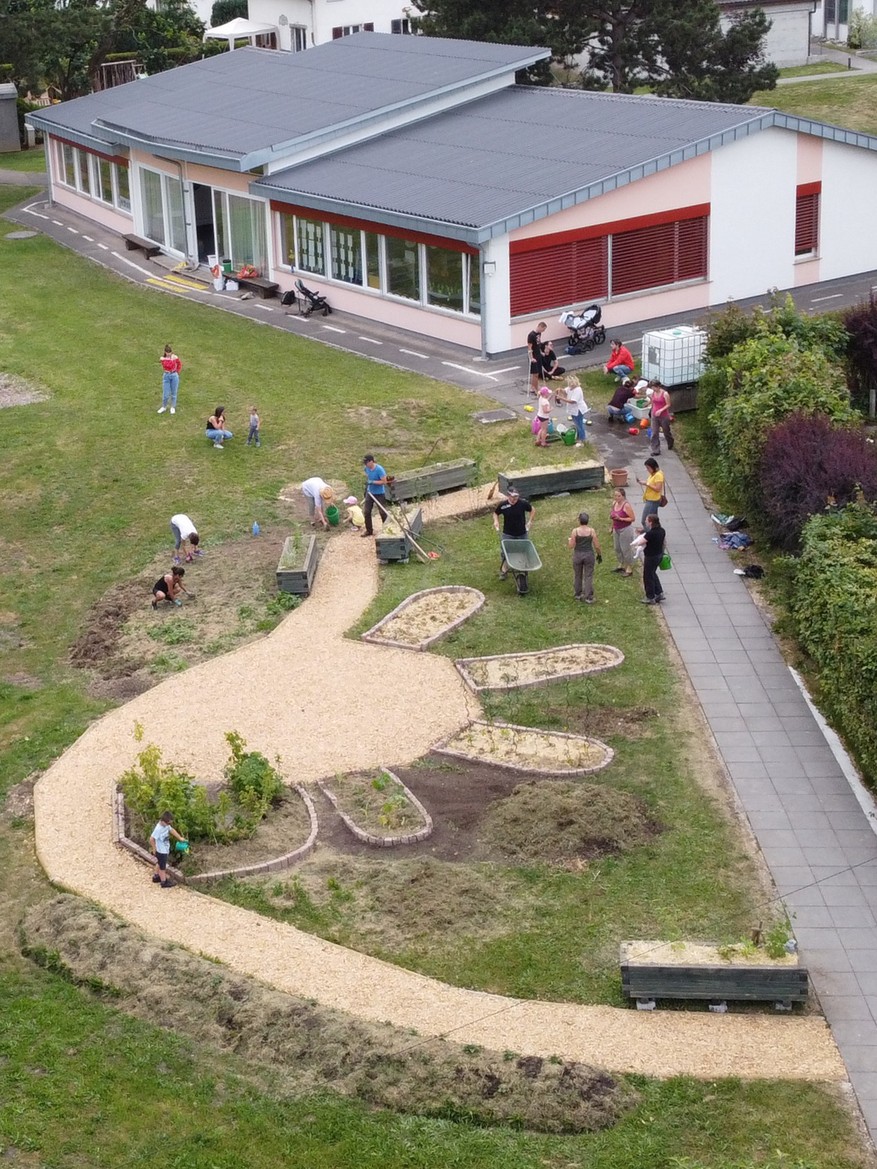 «Les chemins en copeaux de bois permettent l’infiltration de l’eau. Pour l’arrosage, un réservoir a été installé afin de récupérer l’eau de pluie. En plus de l’arrosage effectué par les enfants, il permet aux parents bénévoles de venir s’occuper du jardin lorsque l’école est fermée»