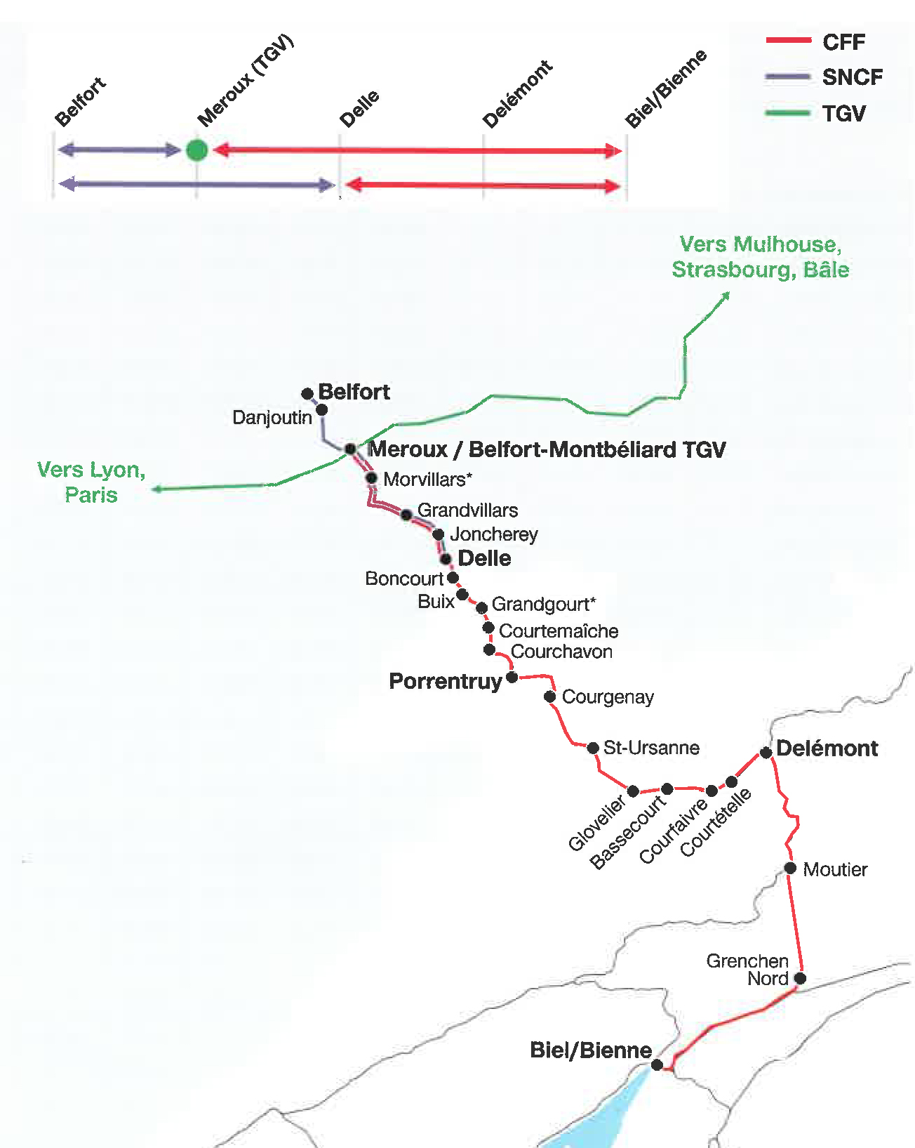 Depuis le 10 décembre 2018, des trains de la ligne CFF Bienne-Delémont-Delle poursuivent leurs parcours jusqu'à la gare TGV de Belfort-Montbéliard (Meroux) et proposent des correspondances avec la plupart des TGV vers Paris, Mulhouse, Strasbourg et d'autres destinations en France.